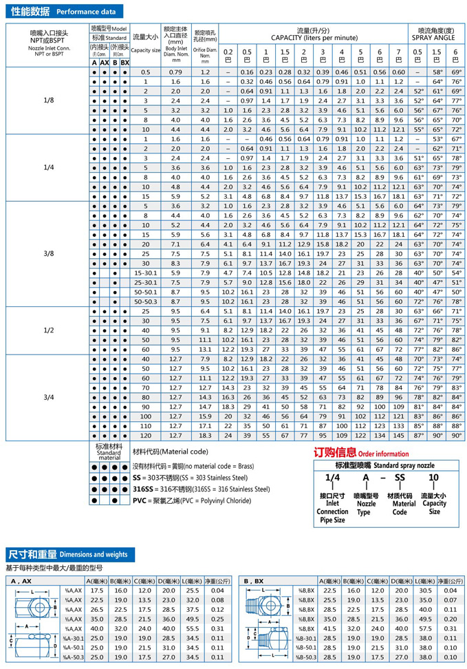 AX-W和BX-W系列廣角扇形噴嘴具有與A-W和B-W系列同樣的性能,外加延長壽命的坡底設(shè)計優(yōu)點(diǎn),以減少旋流腔中液體旋流的“鉆削效應(yīng)”。